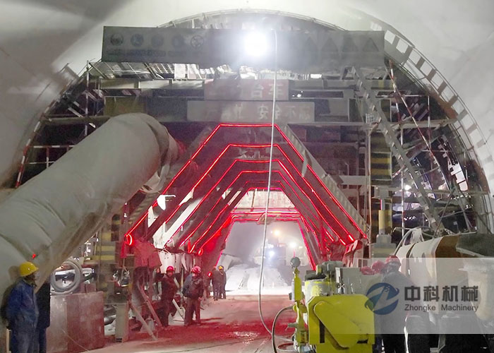 2、安裝固(gù)定拱頂帶模注漿一體機,該設(shè)備放在上一(yī)循環襯砌下方,且靠邊放置,貼安全警示反光(guāng)條。